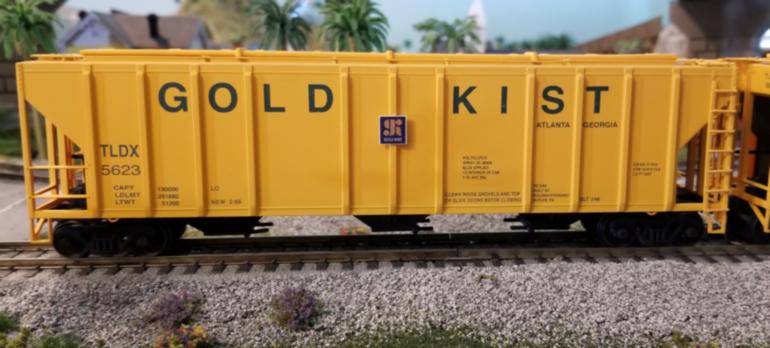 For 2021 we have the Pullman Standard 4427cuft, low-side, three-bay, covered hopper. These PS-2-design cars have a 4-3-4 exterior rib profile. The cars were introduced in the early 1960s, carrying dry commodities, including grain, corn, wheat, flour, etc. These were designed by Pullman to replace the box cars equipped with grain doors which were so common for this service prior to these. The "PS-2CD 4427" cars were very successful and were seen all over the United States, and can still be found in active service today. This particular car is labeled for the General Electric Railcar Services Corporation's TLDX (formerly Transport Leasing, a Division of Pullman, Inc.), and decorated with "Gold Kist" "Atlanta, Georgia". Gold Kist was started in 1933 as a cooperative to help farmers in Georgia who raised chickens (e.g. providing them with chicken feed). In 2004 it changed to a for-profit corporation listed on the NASDAQ. In 2006 the company was bought out by Pilgrim's Pride Corp.
