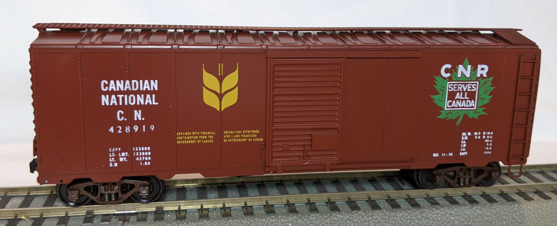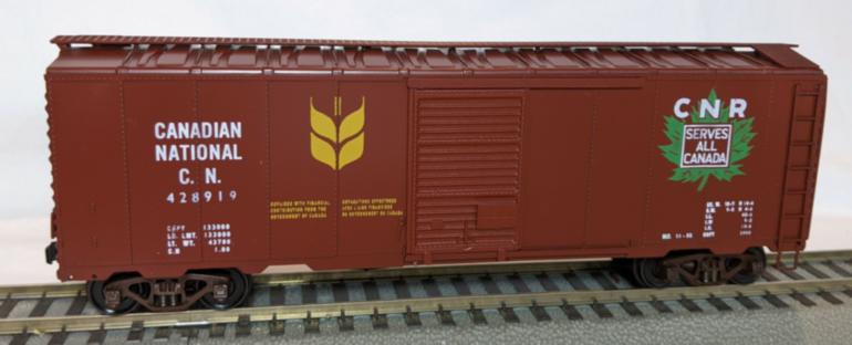 The 2022 car is the 40-foot steel box car for the Canadian National Railway (CN). These cars were the 1980 rebuilds of the original 1955 box cars. They have the green maple leaf logo and a yellow wheat sheath emblem, and come with prototype road numbers.