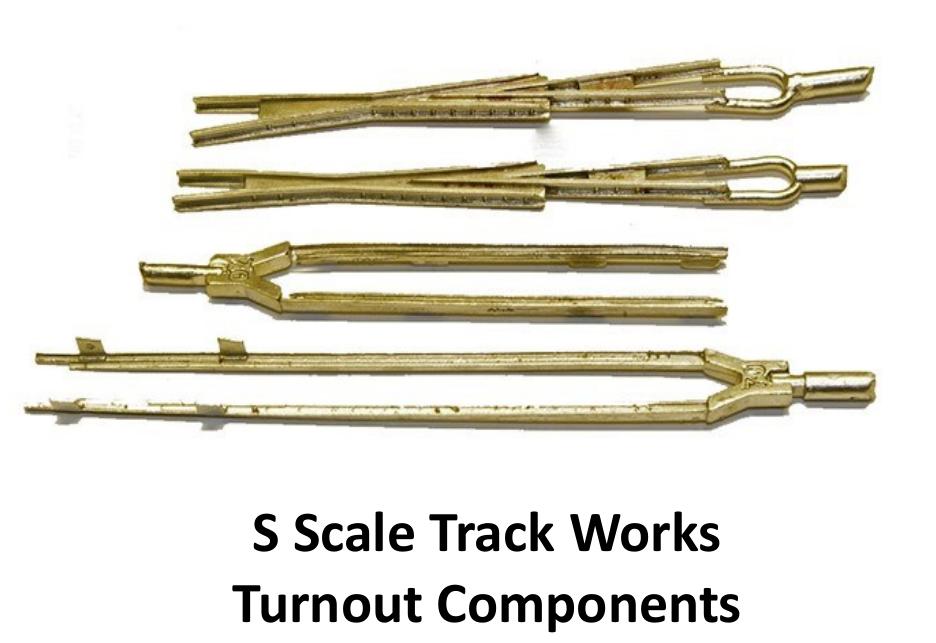 Another option beside ready-to-run track components is offered by S Scale Track Works. They produce a line of cast frogs, points, and guardrails. This system lies between RTR and completely scratch-built turnouts. The modeler lays his or her own ties over a paper template and supplies running and closing rails, but the hard part is already done with finely detailed switch points and frogs. S Scale Track Works offers complete turnout sets or individual castings in codes 100, 83, and 70.
