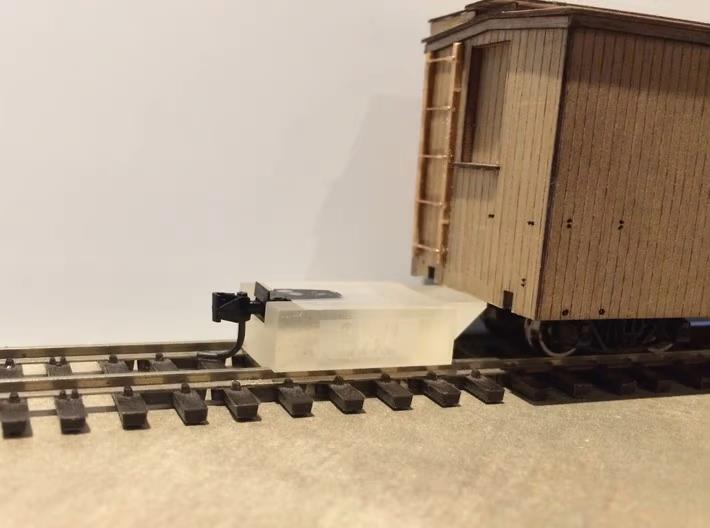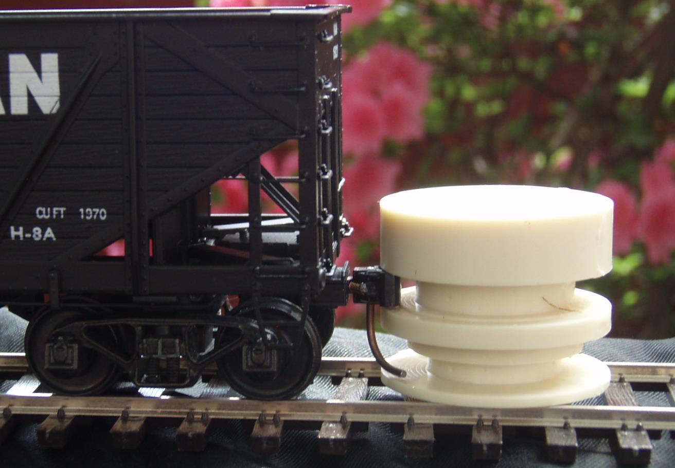 The TruGage is purposely made out of resin so that it can be used on track that has power applied to it. Designed to be used with Kadee-style couplers.
