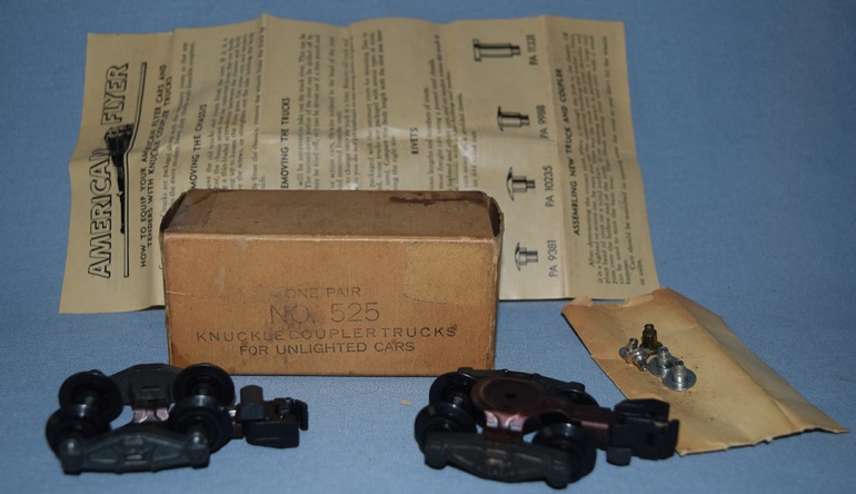 The #525 was produced from 1953 through 1956. They were the replacement knuckle couplers, for unlighted cars, that were packaged in the box shown in the photo along with rivets to attach the trucks to unlighted freight cars. From a collector's standpoint, the value of this item requires the original packaging.