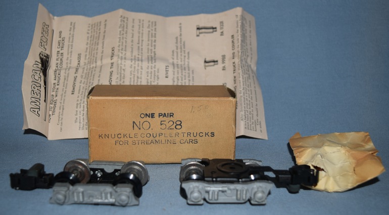 The #528 was produced from 1953 through 1956. They were replacement knuckle couplers, for streamlined passenger cars, that were packaged in the box shown in the photo along with rivets to attach the trucks to a lighted streamline passenger cars. From a collector's standpoint, the value of this item requires the original packaging.