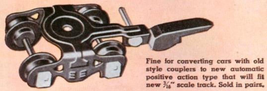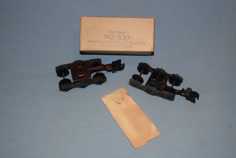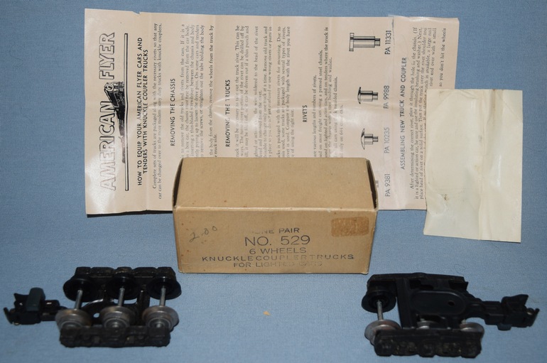 The #529 was produced from 1953 through 1956. They were replacement knuckle couplers, for lighted passenger cars, that were packaged in the box shown in the photo along with rivets to attach the trucks to lighted heavyweight passenger cars. From a collector's standpoint, the value of this item requires the original packaging.