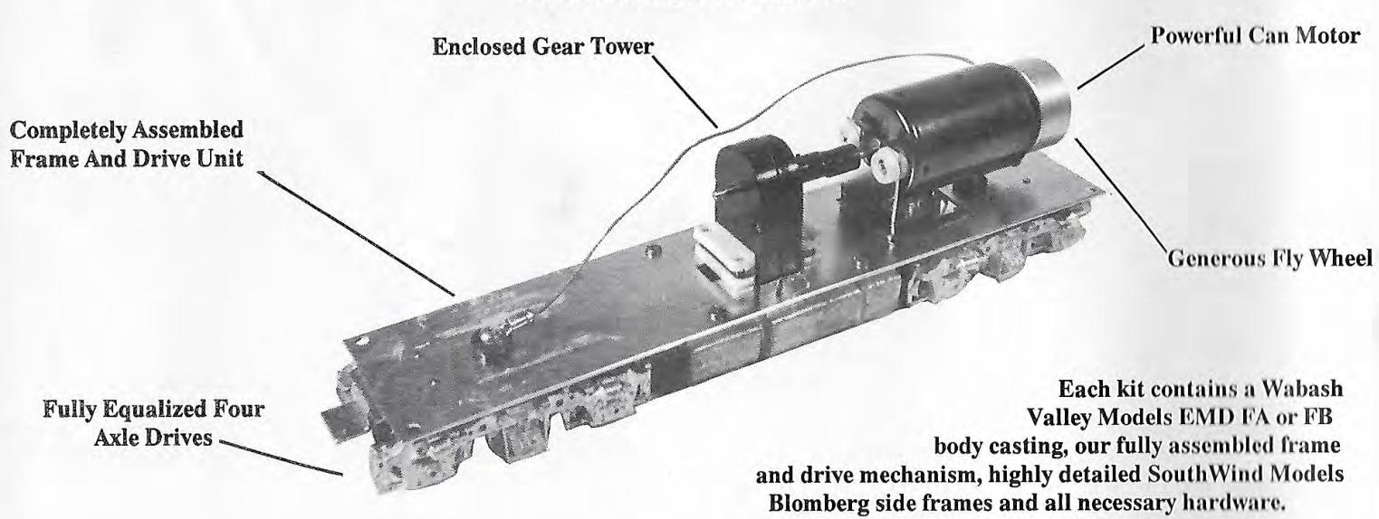 The kit consisted of a one-piece urethane body casting, sprung unassembled brass trucks manufactured by SouthWind Models, a NorthWest ShortLine drive system, a Sagami motor, a formed and pre-drill metal floor, SouthWind Models brass detailing parts, a brass wire, and an instruction booklet. The body shell was actually produced by Wabash Valley, which, itself, was a re-worked Enhorning shell. The gearing was set to match the American Models' FP7 engines of the time, so that these could run in a consist. The super-detailing kit (part #1007S) was also available separately. These models could be used for building a late-F3 model or an early F7 one, with some extra effort by the modeler.