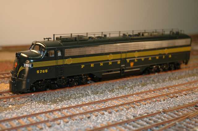 NYC A-B consist pulling a passenger train running on a layout.