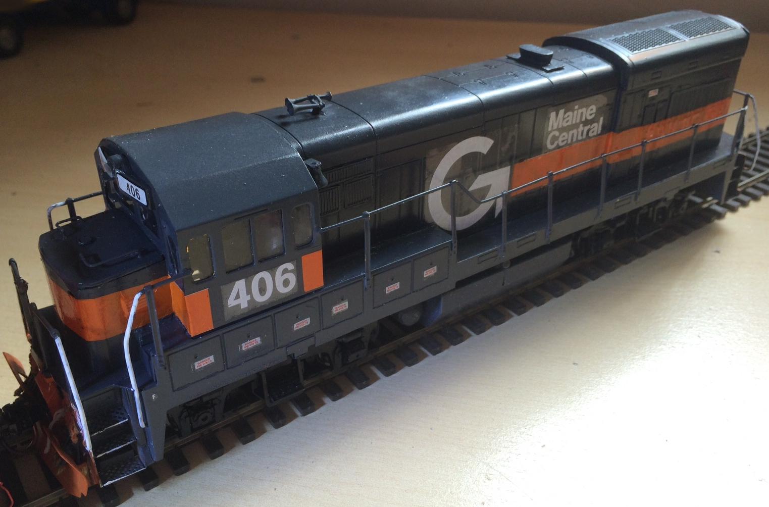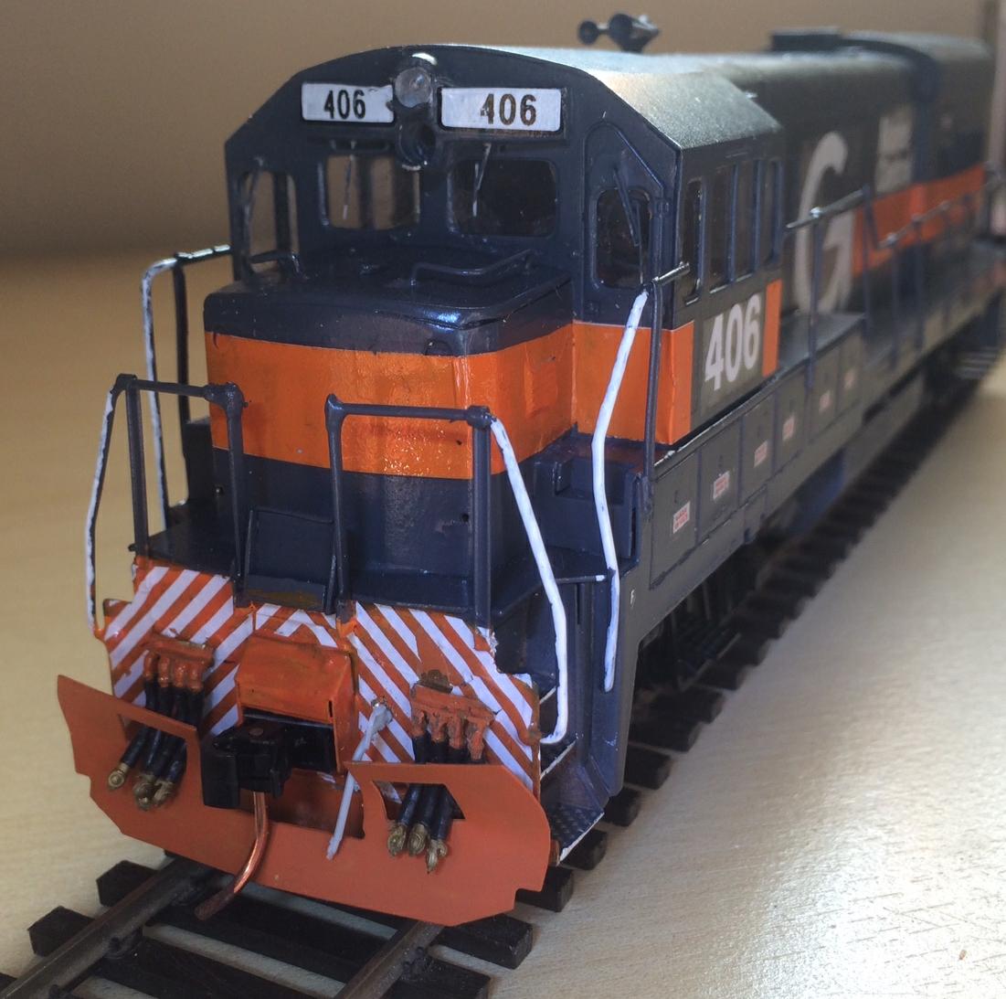 The kit consists of flat brass etchings, some cast white metal parts, screws, nuts, and an instruction booklet. Note that the kit box may state "O scale". The modeler needs to provide everything else to complete this model. AAR Type B trucks are one option (these are the same as American Models' RS-3). Consider tinning the rear of the stanchions to stiffen them, before removing them from the etching. Motor mounts are provided for American Models trucks, or for Black Beetle and NWSL's Stanton Drive type of trucks. The kit is available with the early hood latches (SCL, NdM, SBD, CSX, PICK) or the later type (MEC, P&W, etc). Note that the S-scale model manufacturer Century Models has additional or replacement 3D-printed parts available for this model, if you wish to customize yours.