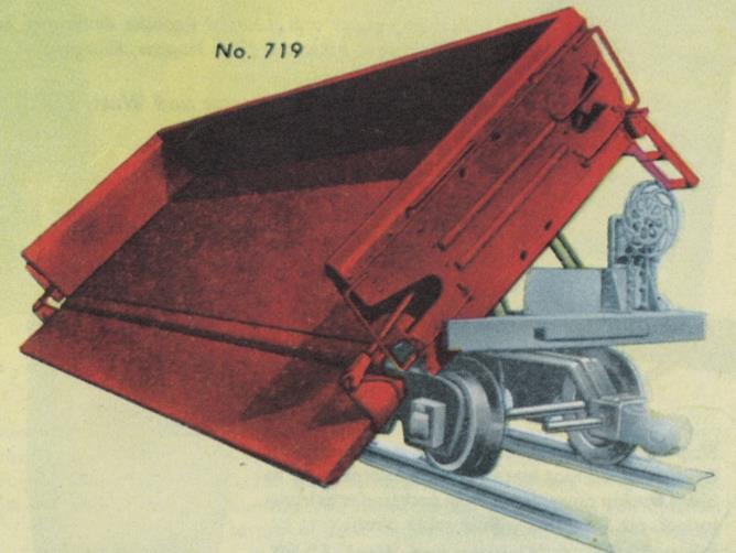 This operating car is controlled via an external button interface and the use of a track trip. When the button is pressed, the side panel falls down, and the entire body tilts over to that side, thereby unloading everything that it contains. The car came with a 4" x 6" metal tray with raised edges which would catch whatever the car dumped. The car came in two versions. In the second photo you can see the plastic-body version that was only produced in 1950. The car in the back of the photo is the metal-body version which was made from 1950 through 1954.
