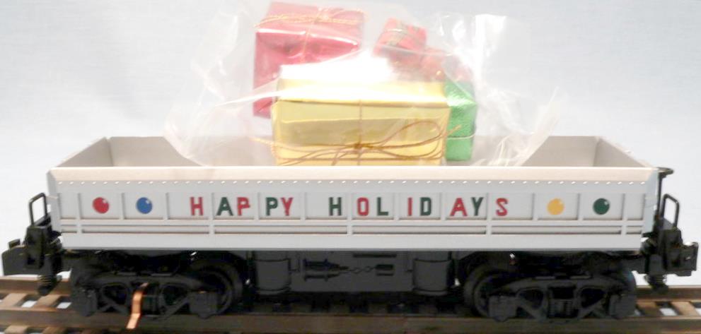 This operating car includes the operating contactor, the dumping tray, and coal. It says "Happy Holidays" on the sides, and comes with wrapped present boxes for a load.