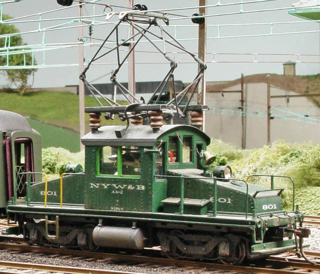 Dick added an old Walthers O-scale 'short' pantograph, S Scale Loco & Supply Reading tender truck sideframes, an Athearn HO-scale SW-7 powered chassis, and Kadee HO-scale couplers. Extra details (headlights, bell, horns, railings, etc.) are from various sources. The model has been painted and lettered by Dick for his private railroad New York, Westchester & Boston, road number 801. He wrote an article about its construction in the June 1997 issue of the S/Sn3 Modeling Guide magazine.