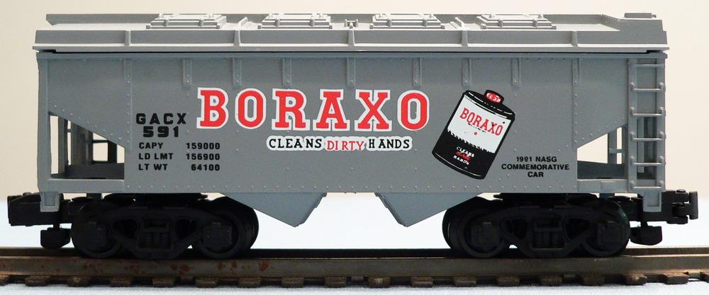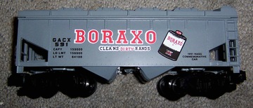 "Boraxo". This was a special run done for the NASG's 1991 edition of the American Flyer Commermorative Car program. The cover is removable, allowing the model to be run as an open-top hopper.