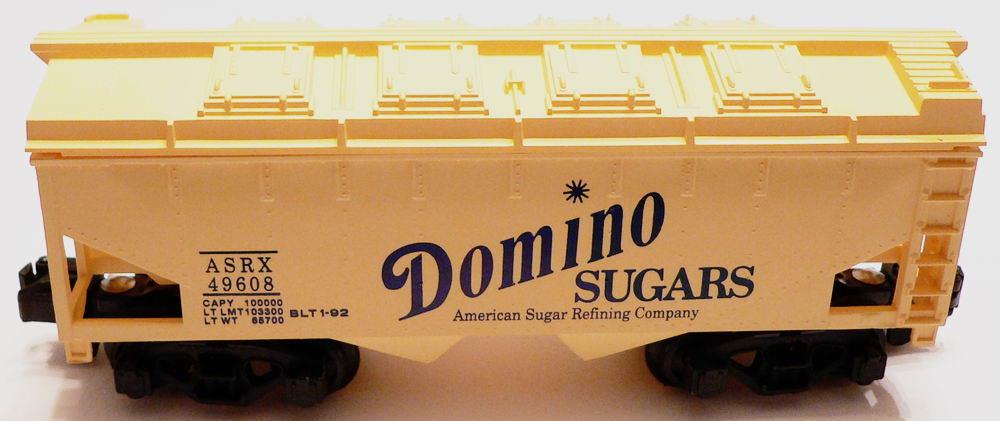 This model has a yellow body color with dark-blue lettering. Leased to Domino S The cover is removable, allowing the model to be run as an open-top hopper.ugars.
