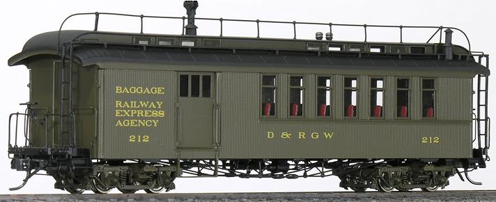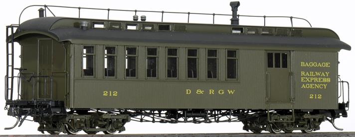 Painted green with gold lettering. Two versions were produced. One had the full brakeman's roofwalk with handrails (early 1940s), and the other had a clean roof and no ladders (late 1940s, with another version painted orange/silver, for the Silverton train).