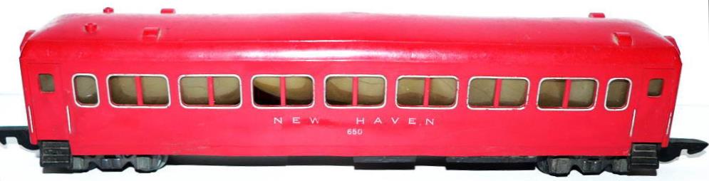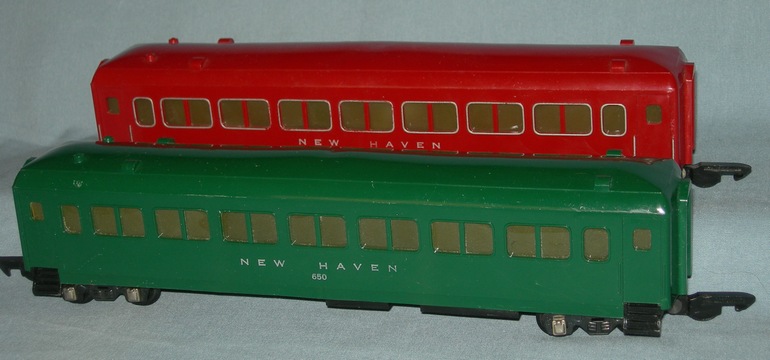 These cars were produced through 1953. They went through several generations of changes during their seven-year run. In the photo are examples of an unlighted green, and a 1946 lighted red car with silver lettering. In 1946 some materials were still in short supply, such as light assemblies, so Gilbert was forced to manufacture certain passenger cars and cabooses that were planned to be lighted as unlighted items. The box these items came in typically had the part number stamped on the end flap followed by "NL" indicating "no light" (e.g. "650NL"). Since the green passenger cars were offered as part of the lower priced sets, many of these cars came without lights, as was the case for some of the 1946 cabooses. The other issue with nearly all of the 1946 plastic cars is that they warp as can be seen in the photo. The warping was because of the new acetate plastic used at that time which was unstable. Gilbert tried to compensate or solve the warping issue by changing the frame material on the #650 cars thus creating several variations. In 1947, the red coaches were given diecast frames. Starting in 1948, the green coaches were also given the diecast frames. Starting in 1949, Gilbert also used sheet metal frames on some of the coaches of both colors.