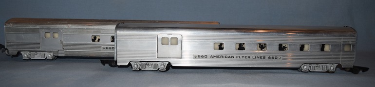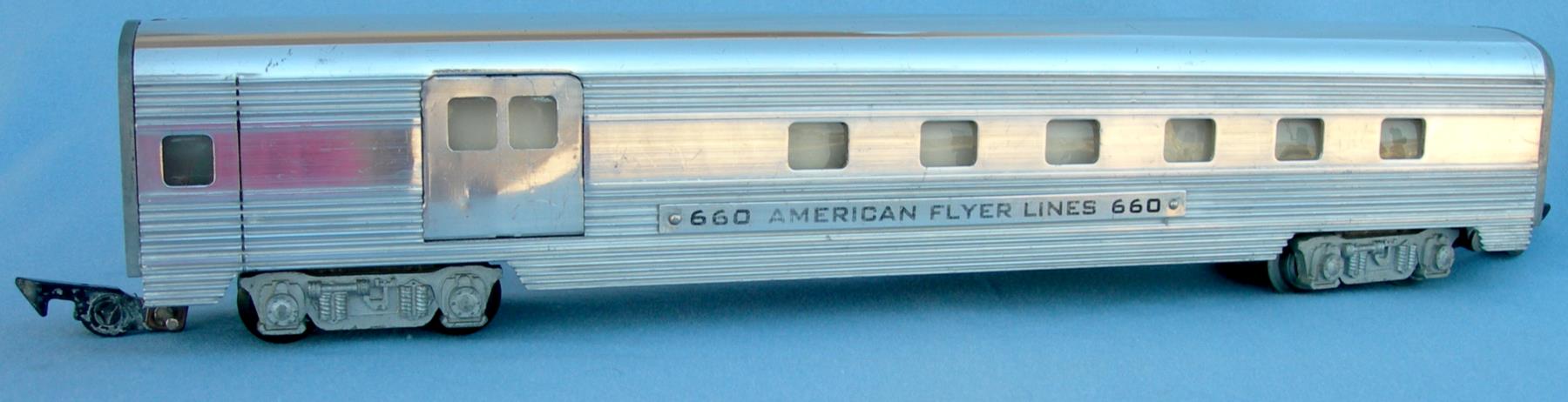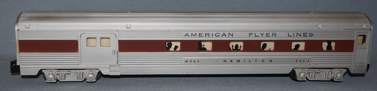 1954: white body with a chrome finish that was painted satin silver; "baggage" was painted over and the car was re-lettered with "American Flyer Lines".