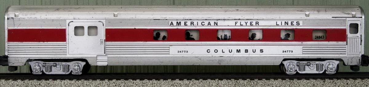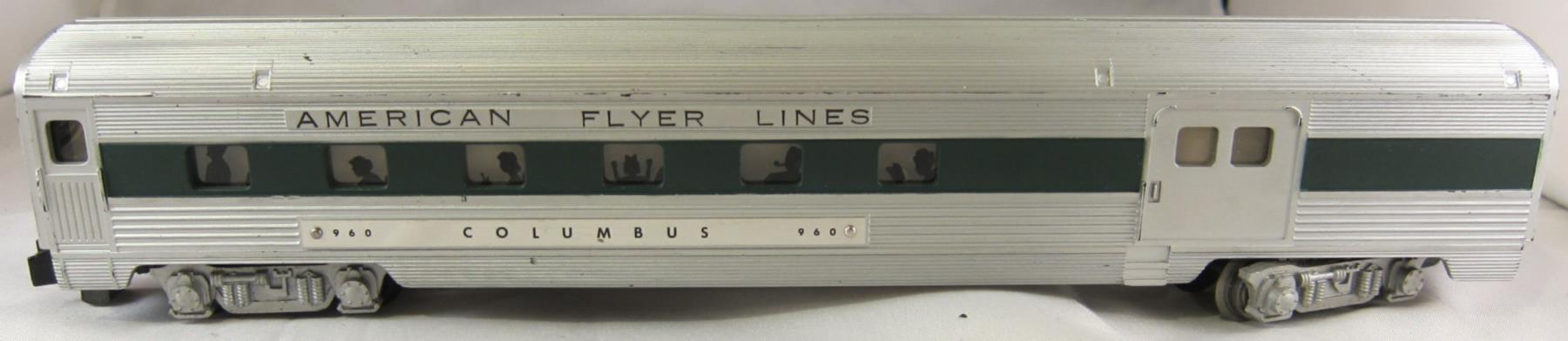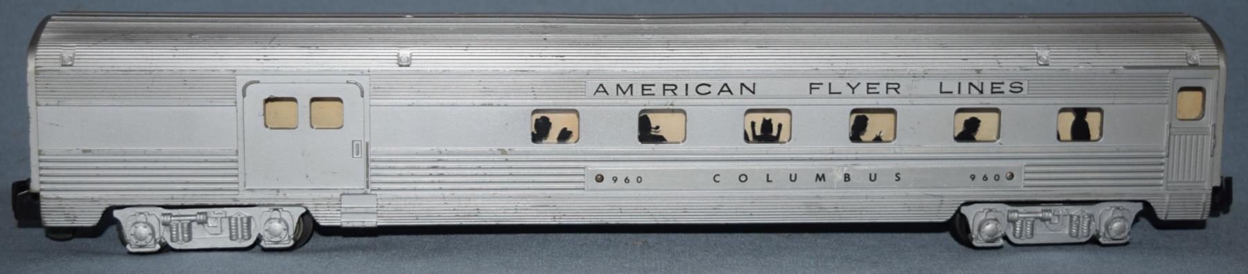 3. black body painted silver (very rare); it is a factory-modified 1952 #500 car; "baggage" was painted over and re-lettered "American Flyer Lines"; the #500 nameplate was reversed and marked "960 Columbus 960"; the link couplers were converted to knuckle couplers.