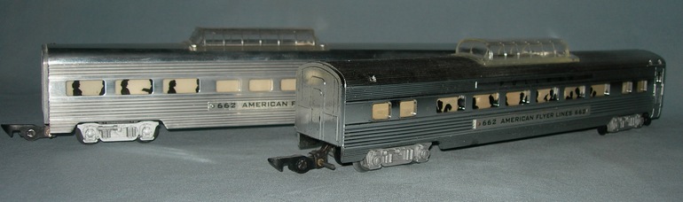 1954: cream body with a chrome finish that was painted satin silver; "Pullman" was painted over and the car was re-lettered with "American Flyer Lines".