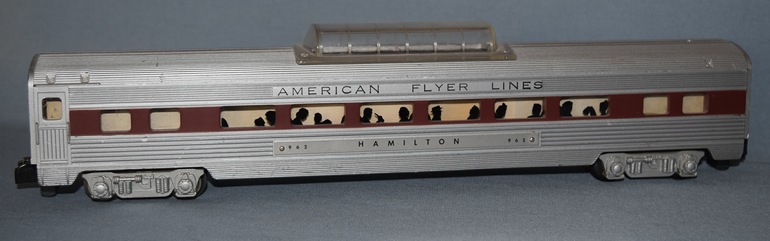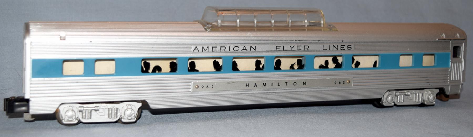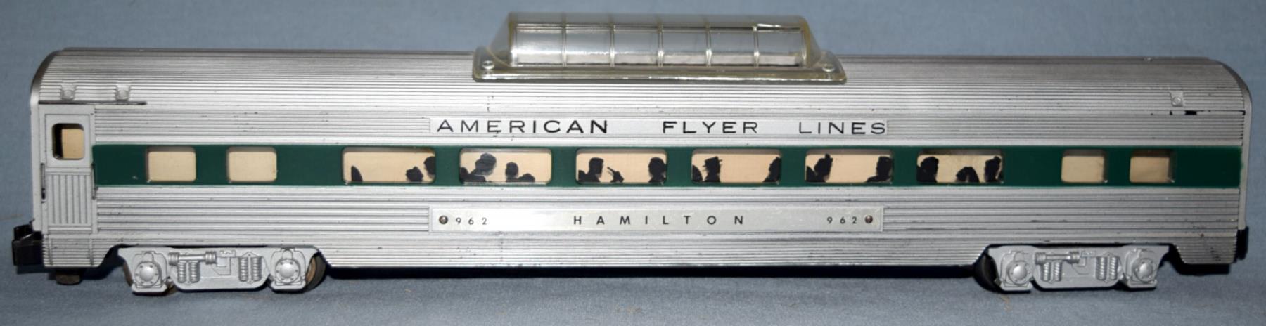 3. black body painted silver (very rare); it is a factory-modified 1952 #502 car; "baggage" was painted over and re-lettered "American Flyer Lines"; the #502 nameplate was reversed and marked "962 Hamilton 962"; the link couplers were converted to knuckle couplers.
