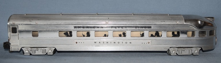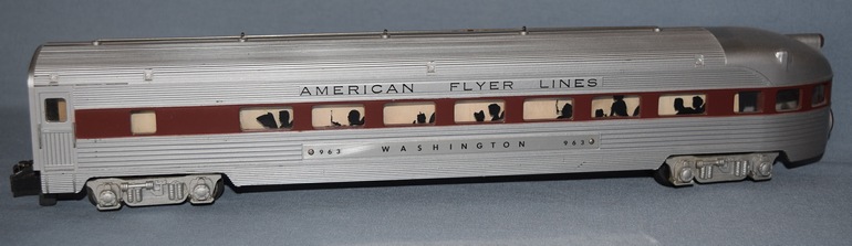 The AFL Washington Observation car #24833 was produced in 1957 and 1958 and again from 1960 through 1962 in two variations. The first variation has "24833" illuminated in the first window. The second variation as shown in the photo has an illuminated "24853" in the first window in place of the "24833". It is apparent that the second variation is a factory error as the window insert used on this variation was the same used on the 1958 #24853 Northern Pacific Observation Car. Could it be this variation was produced in 1958 or was it produced in 1960-62 when Gilbert was attempting to use old inventory of parts?