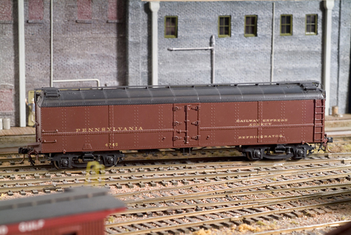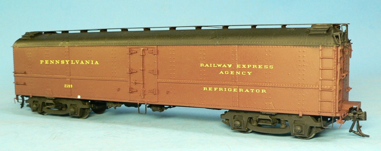 The model has operating ice hatches and sprung trucks. The trucks, appropriate also for any PRR P70 coaches, were available separately. However, the wheels were originally gauged for the old NMRA standard, so they will need some adjustment to the current NMRA/NASG standard, if not yet so done.