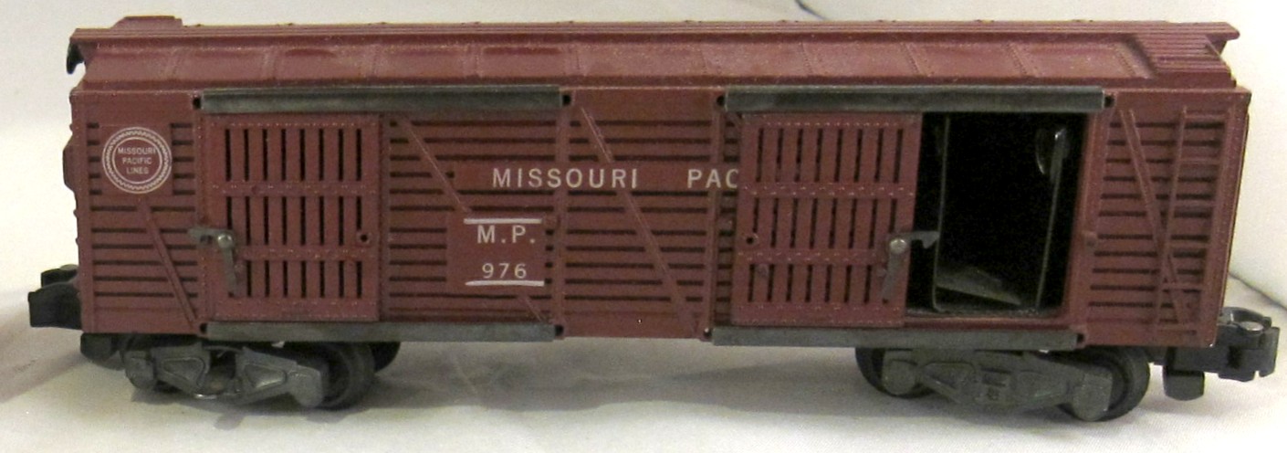 This is an operating stock car (cows enter one door and exit the other door) that came as part of the #K771 Stock Yard animated accessory. It was produced through 1962.