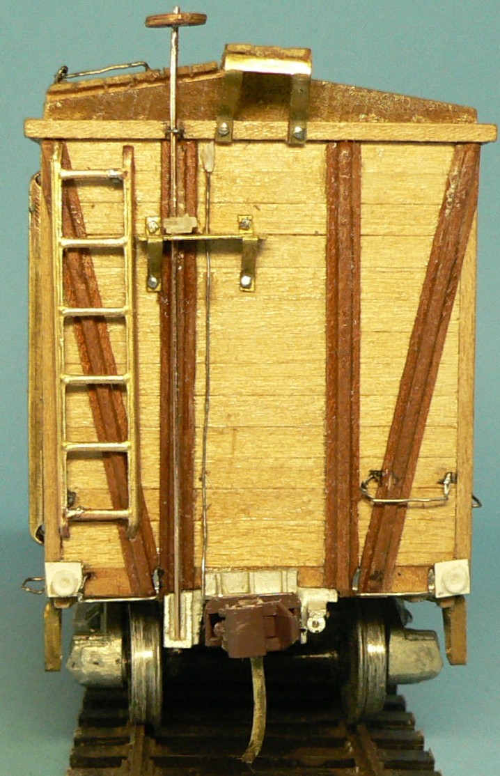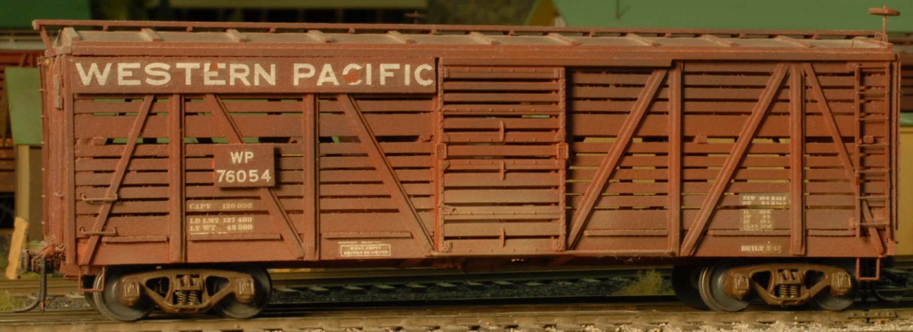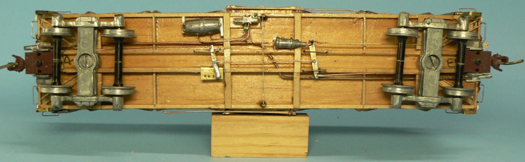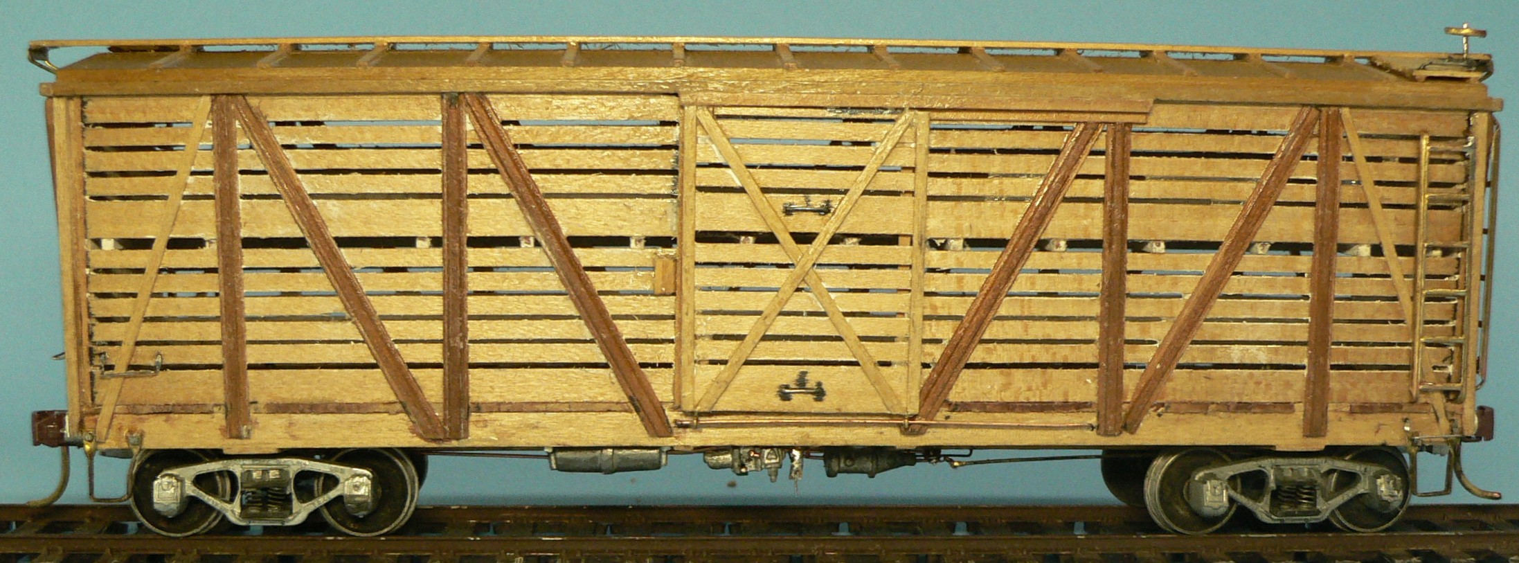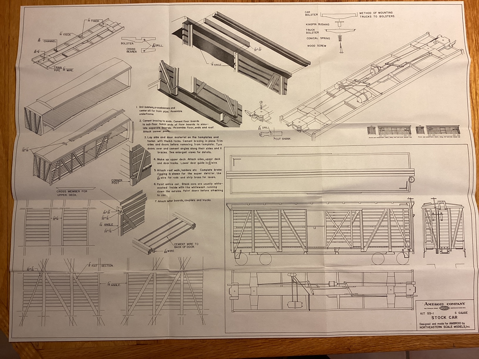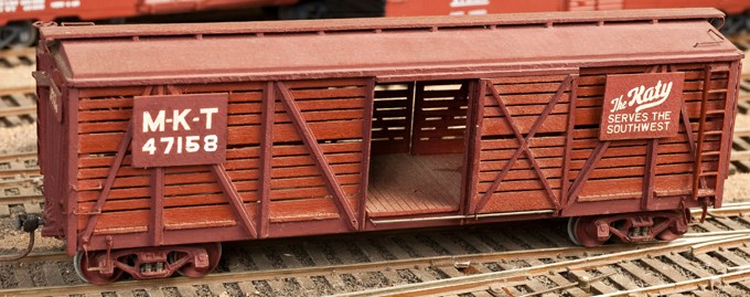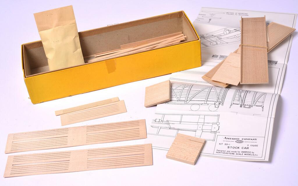 The kit is all wood, but comes with soft-metal and stamped-brass detailing parts. It came with three sets of pre-painted and lettered road name and data boards, namely for the PRR, MKT, and Southern. The model is based on AAR standards and could be built as a single-deck or double-deck version. The original kit came with Northeastern Bettendorf trucks.