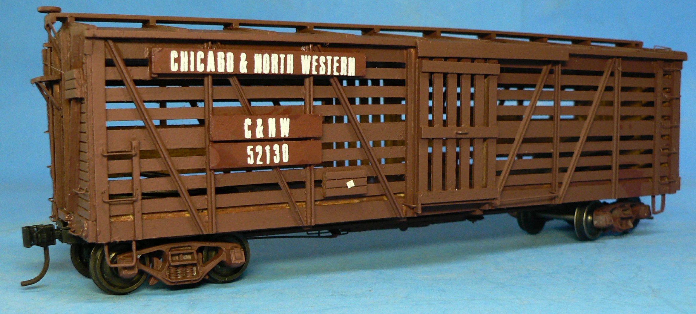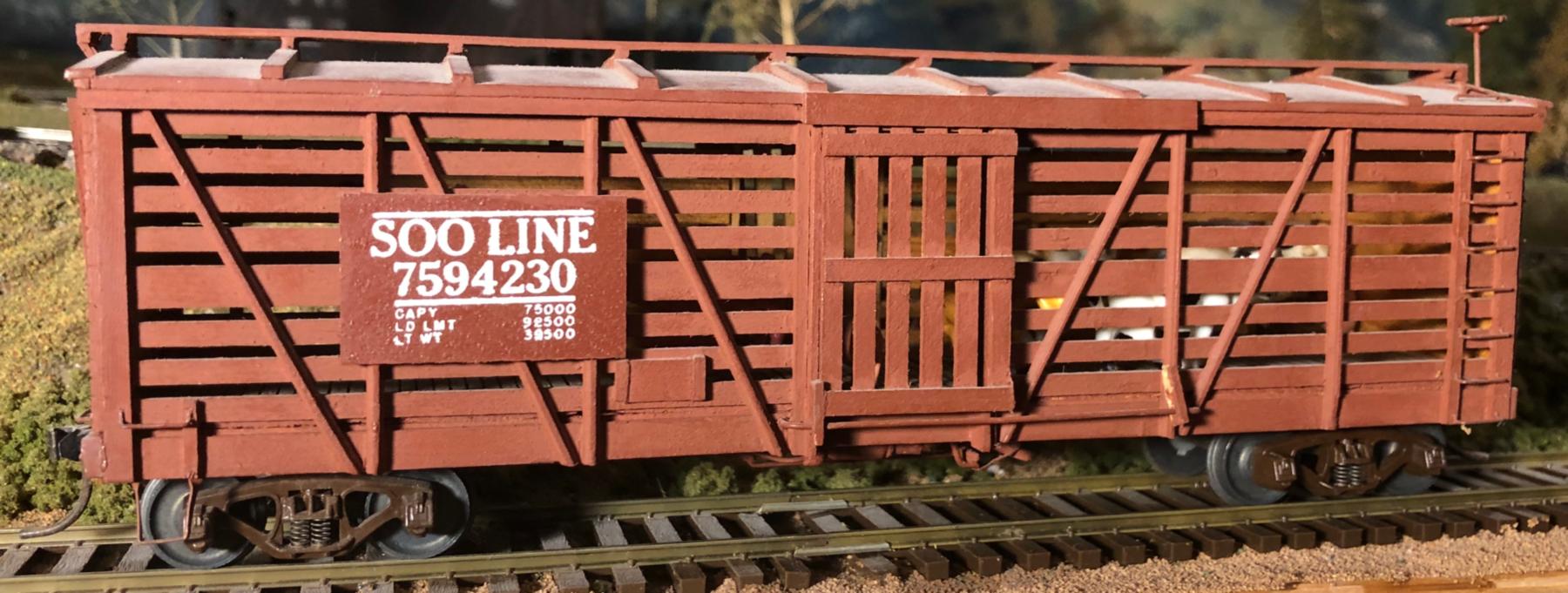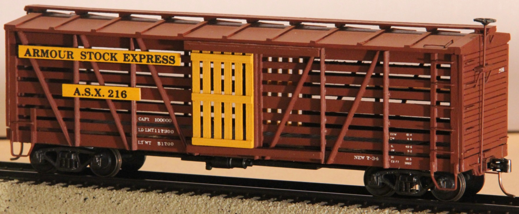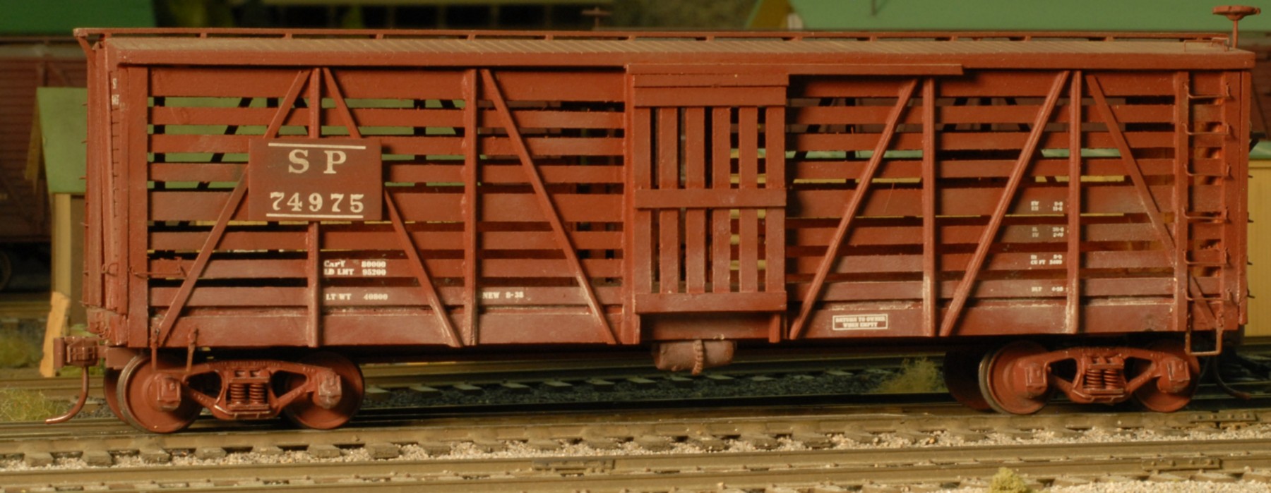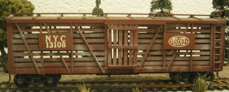 The kit had no manufacturer's number. The kit claims to build a 36-foot stock car, but the final model winds up being a 40-foot car. Also, it is too wide at ten feet. The sides came pre-assembled. Modelers find that the slats are too wide. The instructions that come with the kit are for their O-scale version of this model with an O-scale brake wheel included and cast metal end sills. The kit includes exploded drawings and an O-scale assembly sheet with lettering board location diagrams for 24 different railroads. The lettering supplied was printed on pre-painted boards to be glued to the completed painted car. Also available were Texas & Pacific, Southern, and Erie versions. No decals were in the kit for the data lettering. The finished model is quite light.
