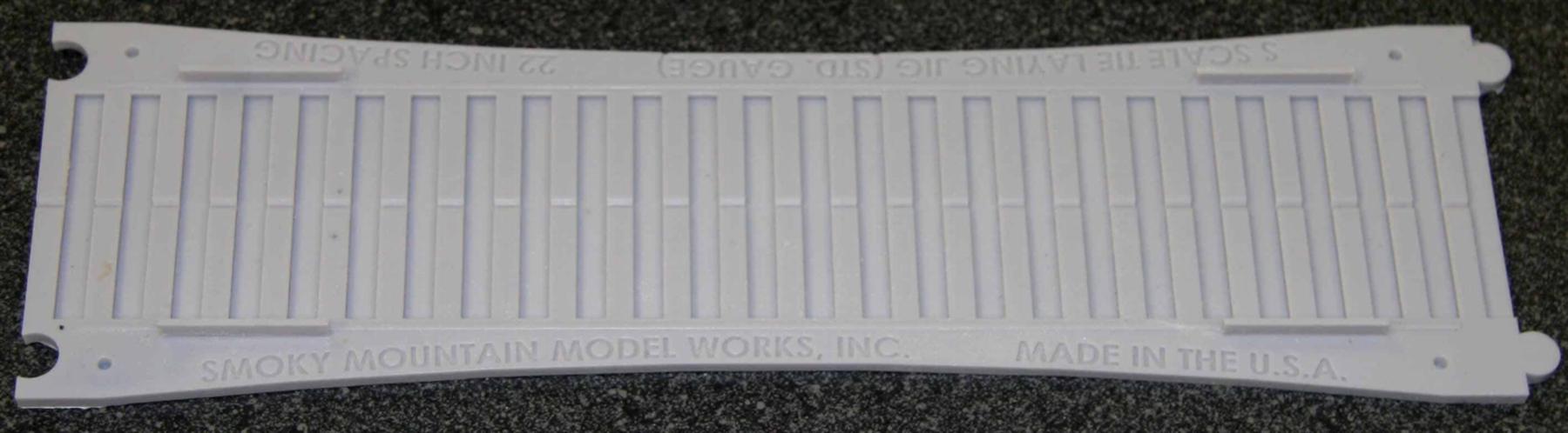 For hand-laying ties placed at 22-inch spacing. Tabs and notches are molded in to allow for multiples of these jigs to be connected. These are available singly or as a three-pack. Use these to lay out your ties, then either spike your rail to the ties, or use masking tape to hold the ties in position and place them on the layout that has glue applied to the area. The jig helps you lay straight and correctly-spaced ties.