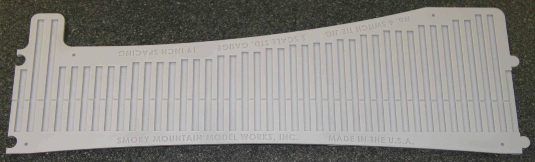 For hand-laying turnout ties placed at 19-inch spacing. Tabs and notches are molded in to allow for multiples of these (or the company's straight-track) jigs to be connected. Use these to lay out your ties, then either spike your rail to the ties, or use masking tape to hold the ties in position and place them on the layout that has glue applied to the area. The jig helps you lay straight and correctly-spaced ties.