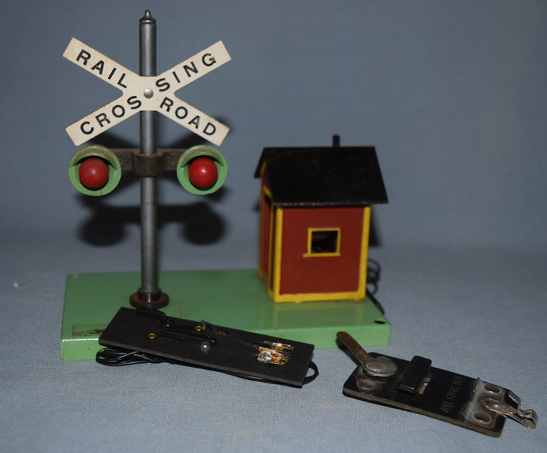 The #23764 Highway Flasher has only one variation, and was produced from 1961 through 1964. The flasher itself is identical to the 1949-56 #760 and the 1957-60 #23760 Highway Flashers that both came with two #696 Track Trips. 1961 saw the introduction of the new Pike-Master line of track. As a result the #696 Track Trips did not work with the new line of track. Gilbert repackaged the #23760 Highway Flasher with one #696 Track Trip for older track and one #XA16A593 Pike Master Track Trip (see Photo #2 for a close-up; Photo #3 shows it positioned on a section of track) for the new track. The Highway Flasher then received the new catalog number of 23764. Note that the Pike-Master Track Trip #XA16A593 was not sold separately and was only available with the #23764 Highway Flasher and the 1961-64 #23763 Bell Danger Signal.