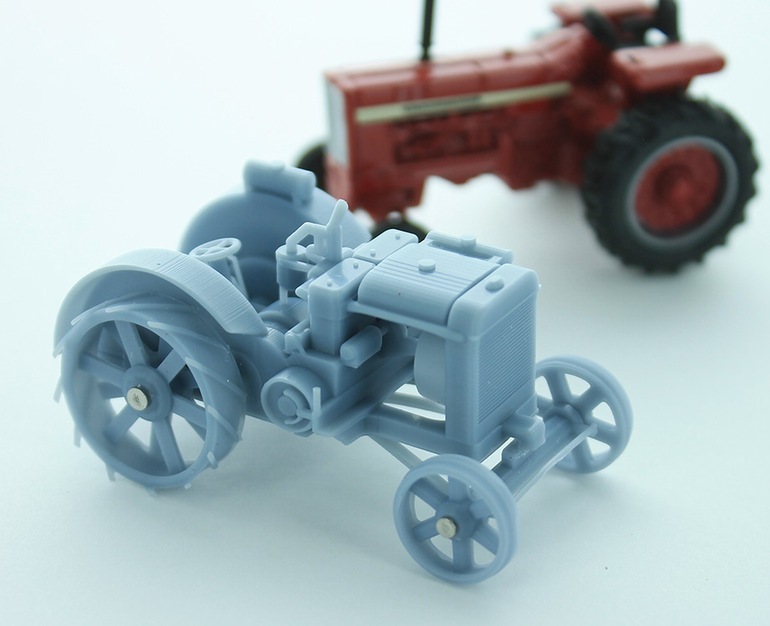A vintage-style 22 to 40hp farm tractor from the 1920s. 3D-printed in ABS plastic. Arrives assembled, unpainted, and a few strands of the printing process may need to be cleaned up. The manufacturer's link takes you to the newer version, and it is now a kit, which may make it easier to paint (see Photo #4).