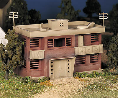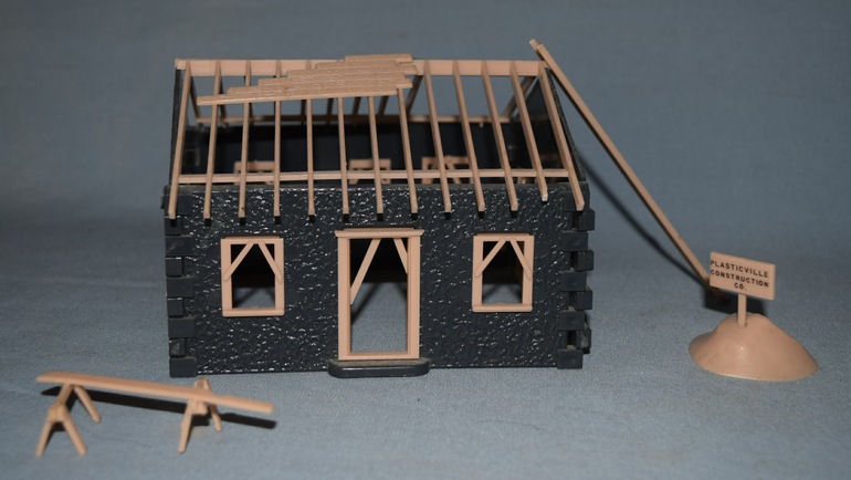 The main photo is of Bill's model, which he detailed with a full interior, as well as enhanced the exterior of the model. Photo #2 shows the color plastic parts of the original kit, with the white styrene details that Bill added. To reduce the overall height of the model, he removed a portion of the concrete base of the kit, and removed a section near the middle, so the second floor wasn't as tall. Bill has since added tar paper roofing on the lean-to shed, and a lamp over the first floor's door. Photo #3 shows a photo of the cover of the kit's box.