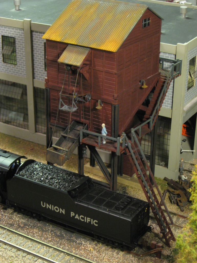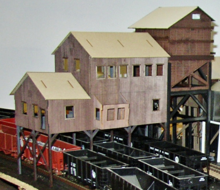 The main photo shows the Plasticville coaling tower (on the right) integrated into the B.T.S. Cabin Creek Coal Tipple kit. Bill added additional framing and support to the Plasticville model. According to Bill, the structures still need more work. This is an O-27 models that can be converted to S-scale. Photo #2 shows the model standing along on Terry's layout.