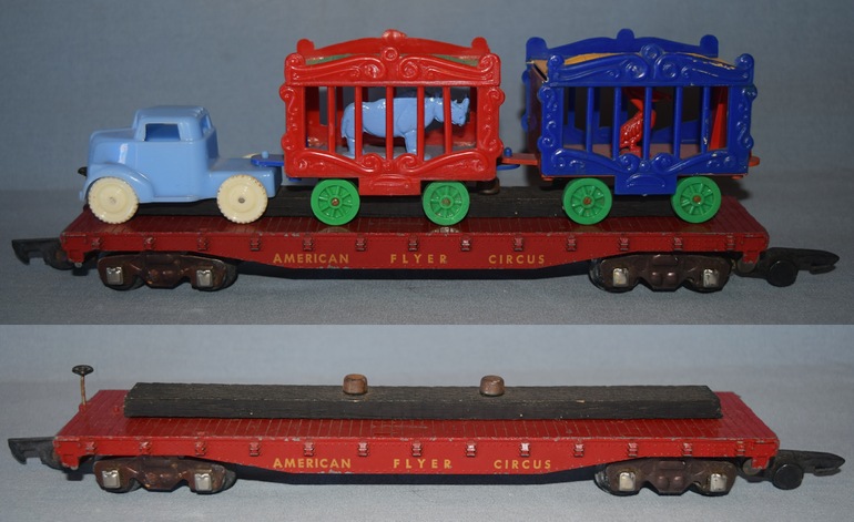 An example of a reproduction, or "PYRO", truck is the red truck. As there are no markings on the truck it is difficult to identify the manufacturer. For more information and photos of the Pyro cars, see the July 2010 issue of the S Gaugian magazine, where on page 25 author Ben Stiles covers that and the ACME Toy Company's circus train loads.