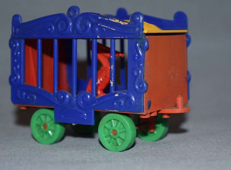 The second color configuration consists of a cage with blue sides, a green roof, and red frame. The earliest cages have dark yellow animals and green wheels. Each cage contained either a pelican, zebra, rhino, gorilla, lion, or a panther.