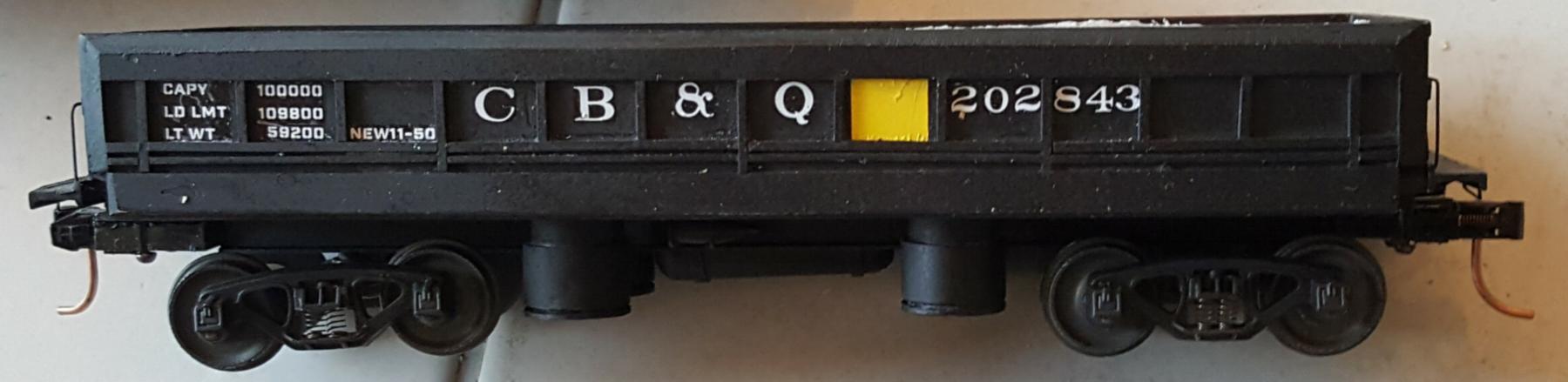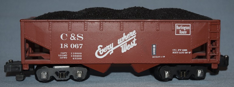 Ted Hamler commissioned LBR Enterprises, LLC in 2014 to take an A.C. Gilbert #921 hopper, repaint it, and letter it for the C&S Burlington Route. The original trucks and couplers were replaced with Ficus trucks and couplers.