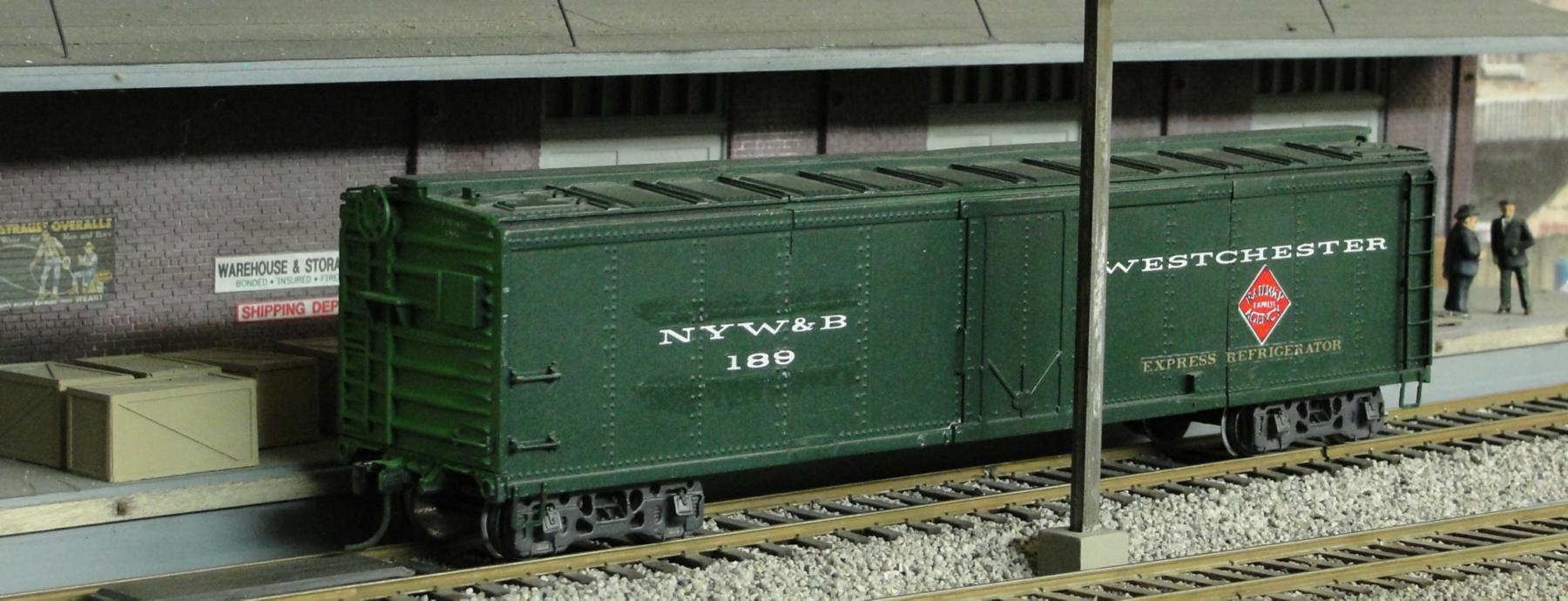 Dick Karnes used two A.C. Gilbert American Flyer plug-door reefers, cut them apart and re-glued them back together. The model's trucks are Allied Full Cushion sold by River Raisin Models.