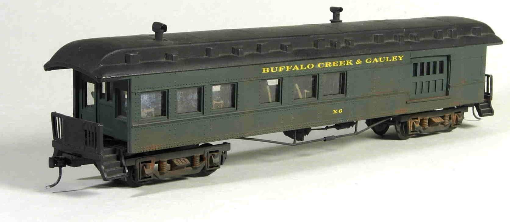 Brooks Stover built this model of BC&G's combine X-6 by splicing together parts from two American Flyer heavy-weight observation cars, blanking out some windows, and scratchbuilding the baggage door. The truss rods were scratchbuilt and the trucks were from American Models. A simple interior was modeled and Brooks had the decals custom-made. The prototype of this car was a 60-foot steel-sheathed car built by Harlon & Hollingsworth (a division of Bethlehem Steel) of Wilmington, DE in the 1880s for the Philadelphia and Reading RR. This was one of Brooks' very first attempts at building a piece of rolling stock from American Flyer shells.