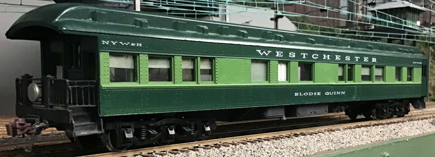 Dick Karnes built this passenger car using two A.C. Gilbert American Flyer car bodies, specifically #654 and #954. He installed American Models' passenger car trucks, and used an old "@#$%@ Train Stuff" observation platform railing.