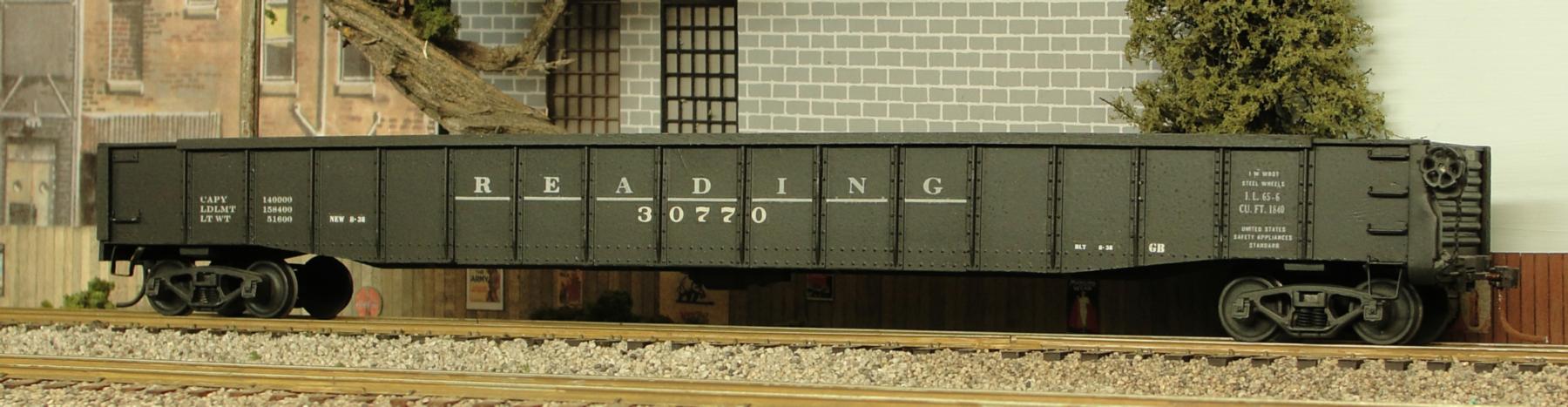 Dick Karnes used two Lionel O27 gondolas, which he spliced together to form this car. The model was finished following a photo of the prototype Reading car.