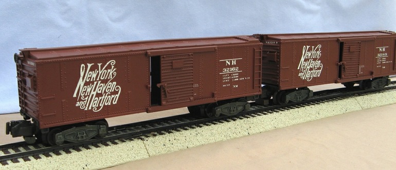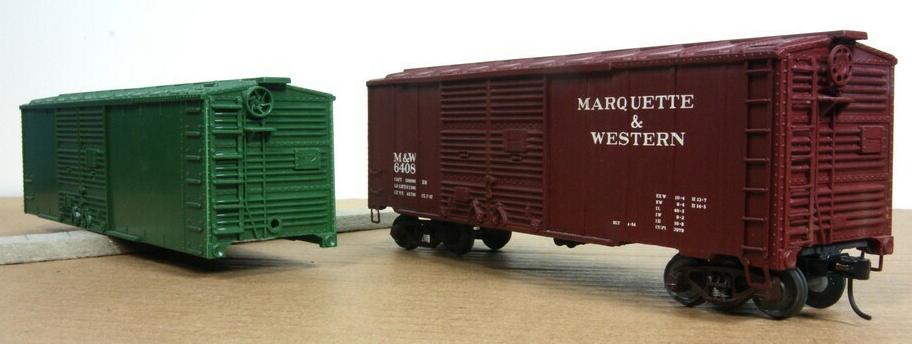 Tom Hawley states that Lionel O27 double-door box cars, gondolas, and center-beam flat cars are all potential candidates. Some kitbashing may be necessary to make them fit S. Rich Gajnak did just that with the box cars (before, left, and after shown here). Rich used an old Ace conversion floor, added American Models ladders, stirrups, and brakewheel. He also modified the sill. He filed down the end ladders and used staples for the rungs.