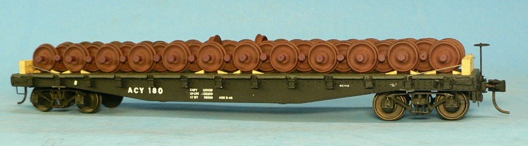 Ed Kirstatter converted this 46-foot A.C. Gilbert American Flyer flat car to scale operation. The car weighs 4oz. To convert the car, he replaced the plastic deck with wood boards, added grab irons, cut-levers, and complete under-body detailing. The trucks are S-Helper Service ones, and the couplers are Kadee S-scale #802. The load of car wheels was made from Pacific Rail Shops' plastic ones (their kits initially came with plastic wheels, and most modelers replaced them with metal ones, leaving the plastic ones for "scenery"). According to Ed, the proper AAR rules for cribbing and blocking were followed.