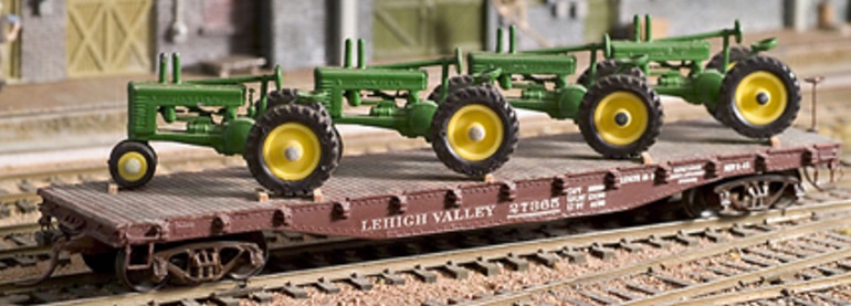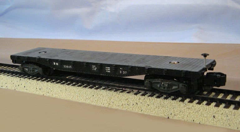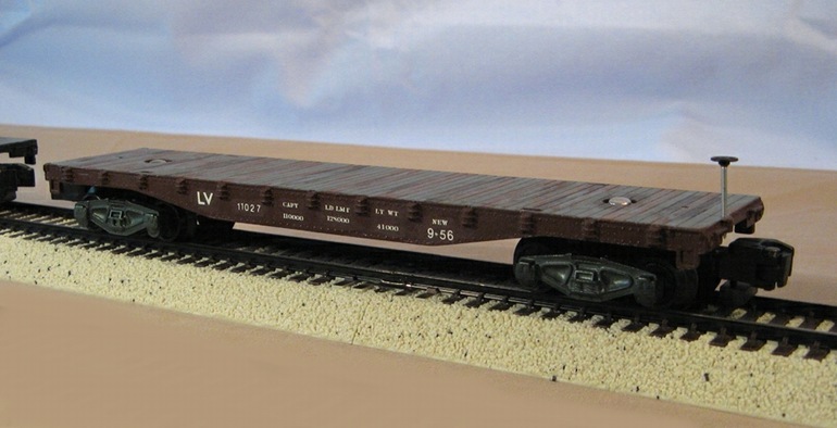 This model was based on a 1956-60 Lehigh Valley flat car from a series which were equipped with jacks and chains for early TOFC service, then they were used in general service, as modeled here. It has a late-1950s to early-1960s appearance. Holt repainted the model, installed AF trucks and couplers, and lettered with custom transfer numbers and letters from both CDS Lettering and Model Graphics (Woodland Scenics). The simulated wood decks have been painted with flat gray enamel, and then weathered with brushed brown enamel and flat clear lacquer.