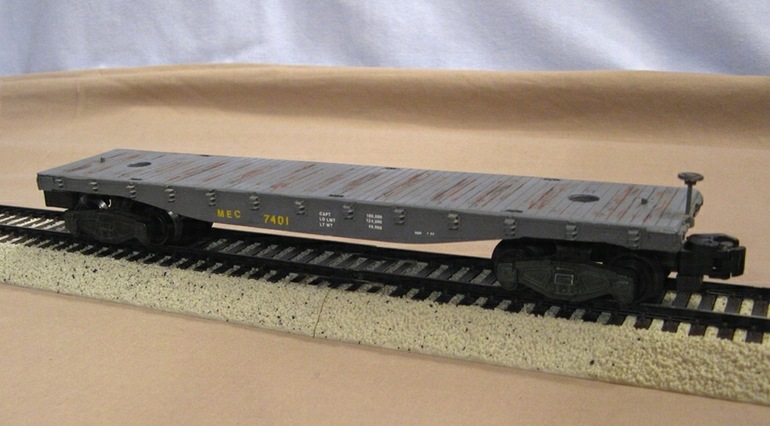 Holt modeled this AF flat car after the only general service flat car the MEC had in 1959. He repainted the A.C. Gilbert model, applied dry transfers, and dry-brushed flat enamel weathering on the deck.
