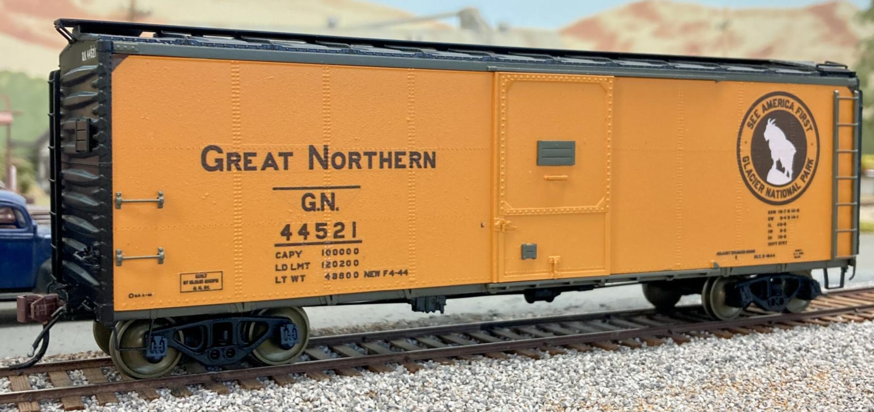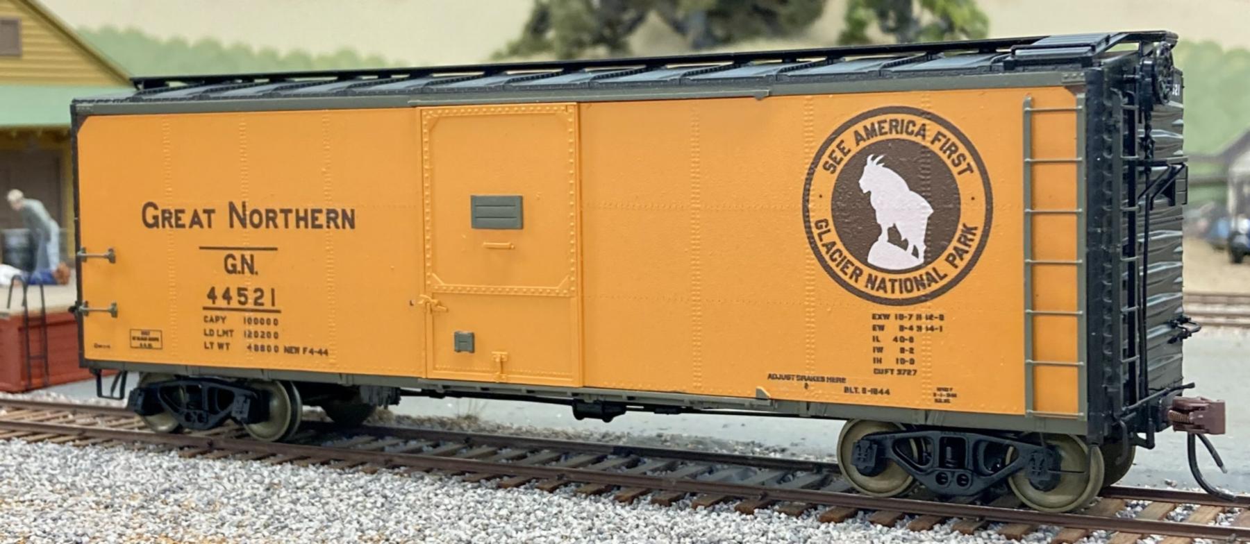 Paul Washburn build a Great Northern plywood-sided box car. He started with a Pacific Rail Shops' box car kit, from which he cut off the sides, and replaced them with sheet styrene to represent plywood. He used styrene for the doors as well. He applied HO-scale rivets from Micro-Mark to represent the fasteners used to hold the plywood in place. The model rides on National Type B-1 trucks from Pacific Rail Shops, with all-metal wheelsets from NorthWest ShortLine. Paul decided to use the recently-announced Ammo RailCenter paints. He used "Reefer Orange" (#AMMO.R-0010) for the body, "Pullman Green" (#AMMO.R-0017) for the roof, and Tamiya "Semi Gloss Black" (#X-18) for the underframe and ends. He then applied K4 Decals set #K4-GN40P-64B.