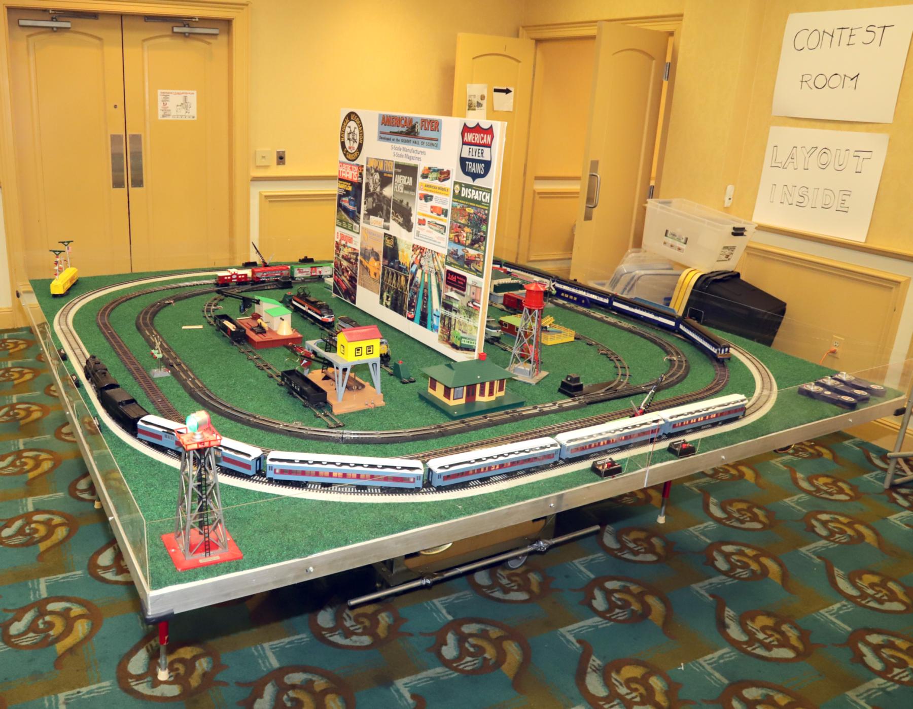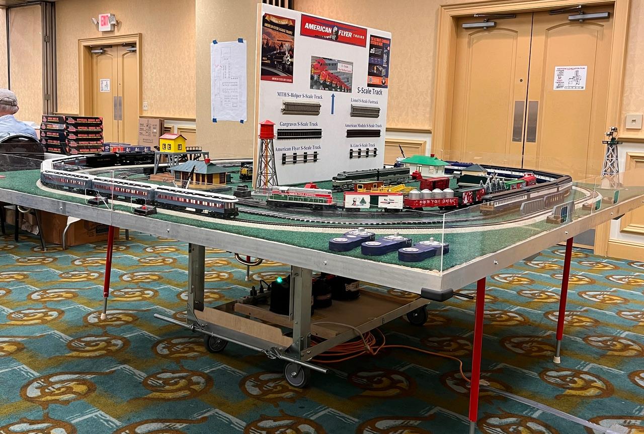 This layout has three loops of track, one using A.C. Gilbert track, another using GarGraves track, and the outer one using Lionel track. The unique approach to this layout is that is quickly disassembles and folds into its own wheeled cart system, so that it can be moved anywhere. Robbie calls it the "Transportable Train Layout".