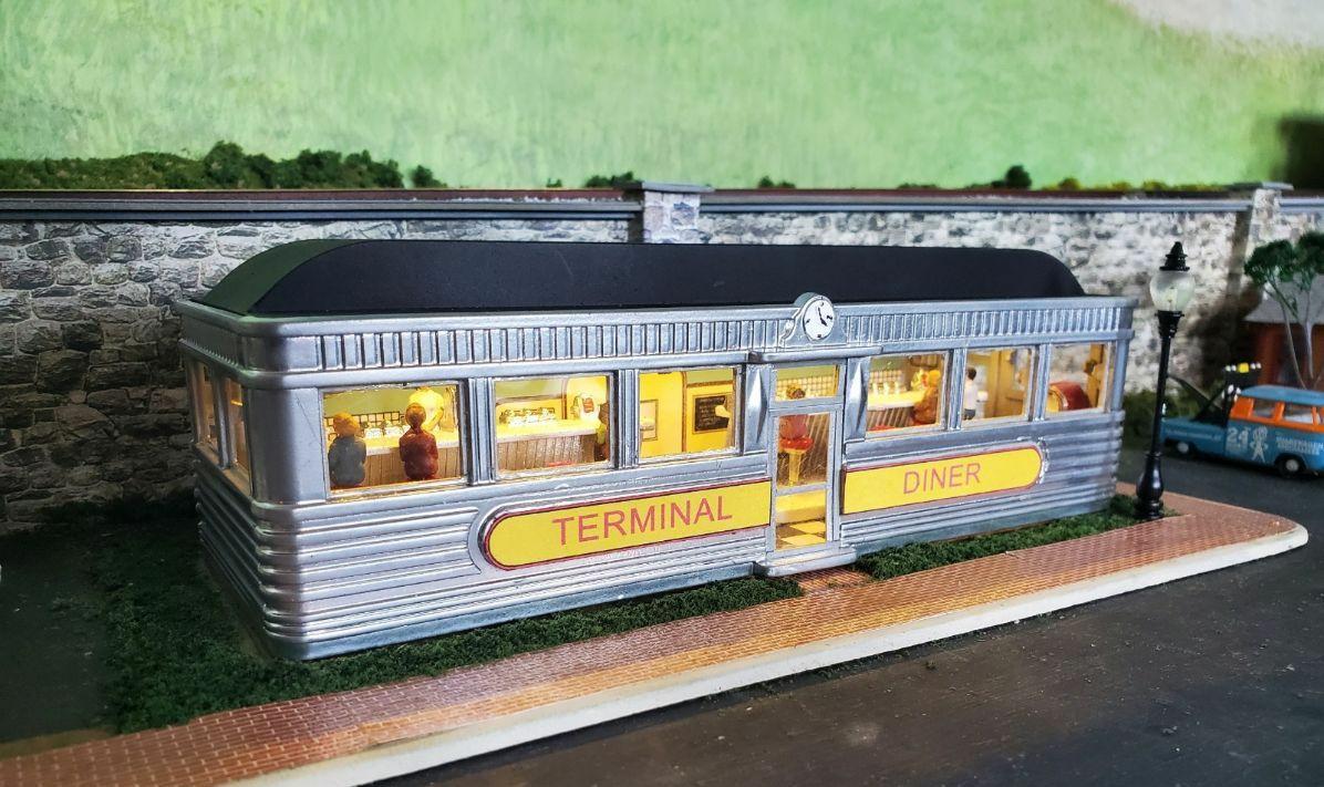 Terminal Diner (#18 in the track plan) has been upgraded to receive interior lights (using 9 LEDs). This is a modified Plasticville structure.