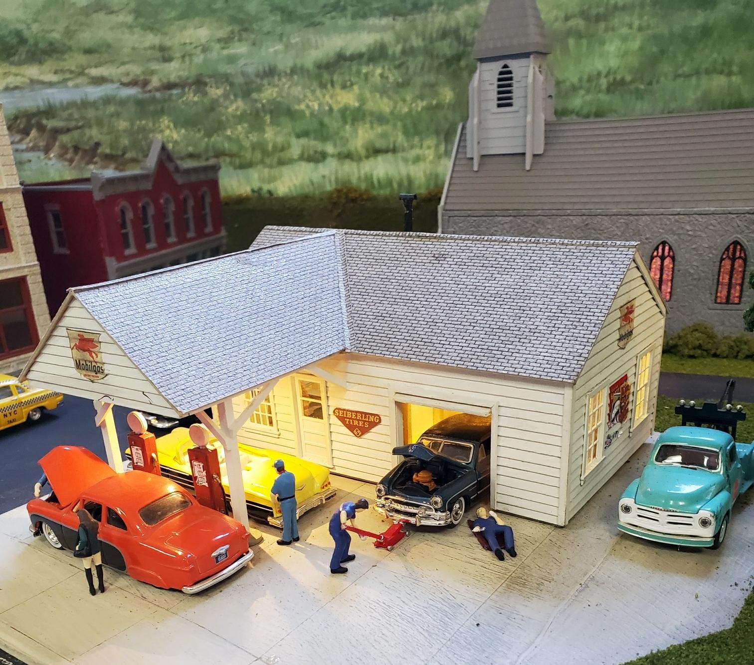 This busy service station is located near the church (#45 on the track plan).