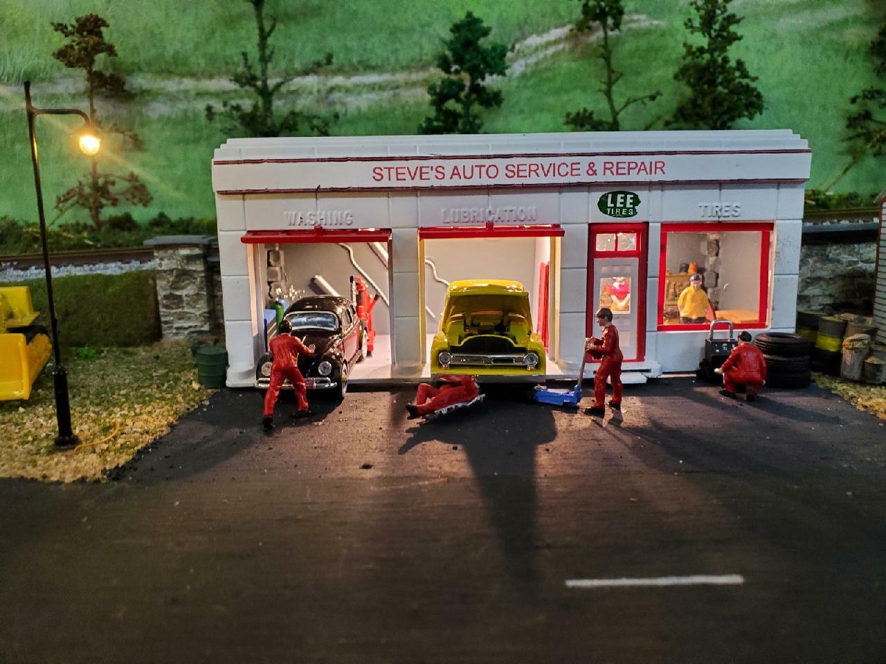 Steve's Auto Service & Repair is a kitbashed Plasticville small gas station. The work was done by Milt Leap. The business is named for Joe's son who is always working on one of the family's vehicles. This structure is #16 in the track diagram.