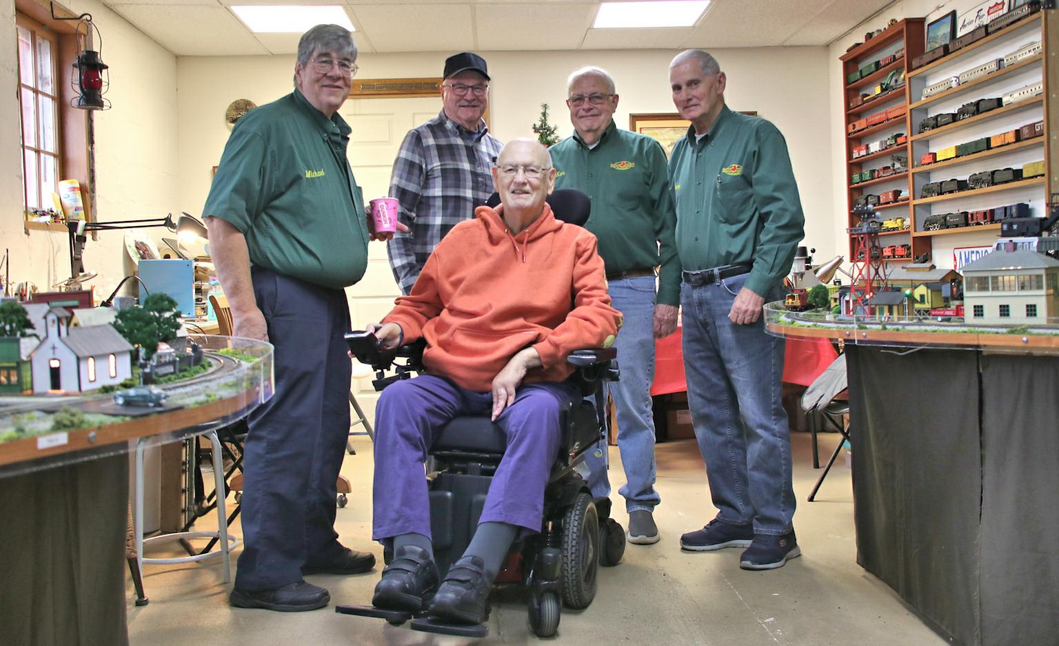 This photo was taken of some of the South Jersey S Gaugers club members visiting Joe and his layout very shortly before Joe passed away. Joe sits at about where his wheelchair is drawn in the track plan at the top of this page.