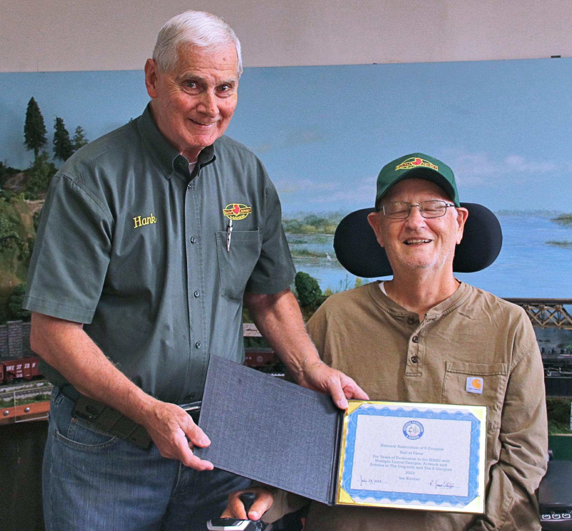 Joe was inducted into the NASG's "Hall of Fame" during the 2023 NASG Convention. This photo shows South Jersey S Gaugers' president Hank Worrell handing Joe the certifcate he received.